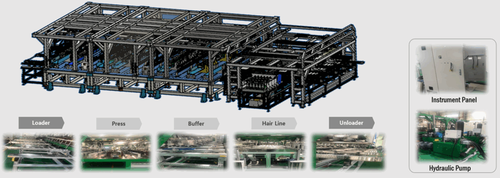 알미늄 TV베젤을 필요부위에 Punching, Notching, Piercing, 단조 후 Hairline 작업을 자동 이송하며 작업하는 장비